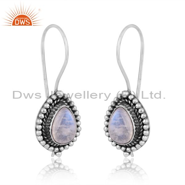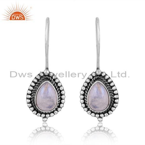Pear Cut Rainbow Moon Stone Set Oxidized 925 Silver Earrings