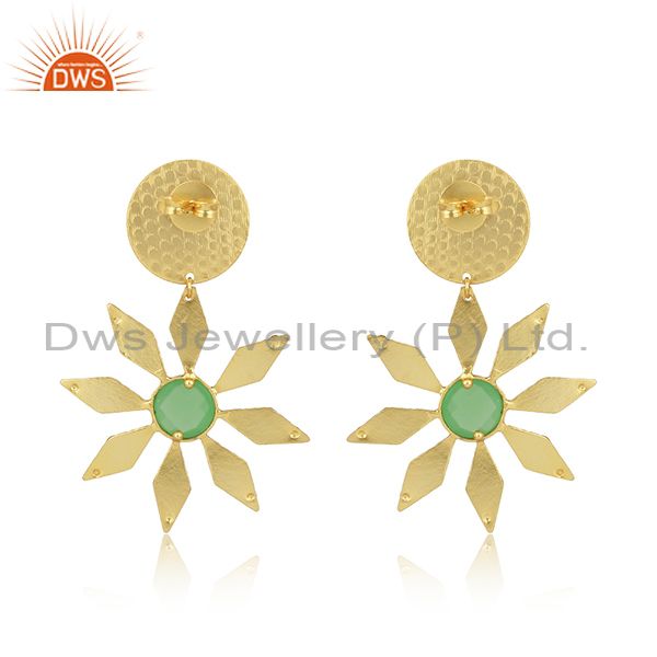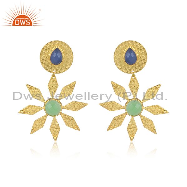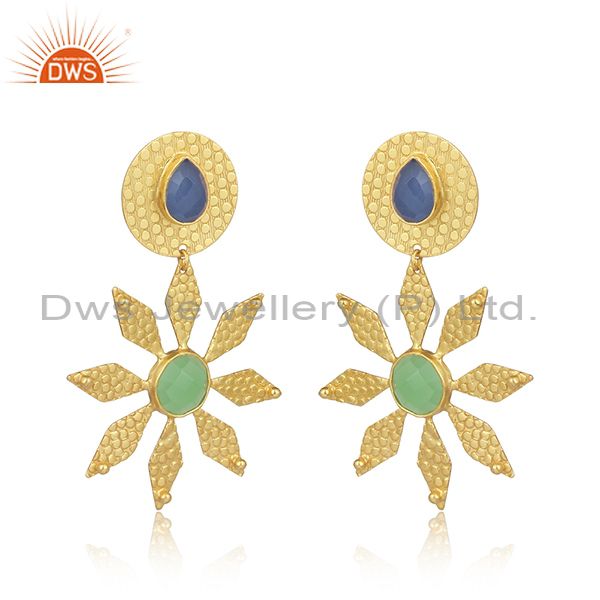 Pear Shaped Glass Blue Chalcedony Set Floral Brass Earrings