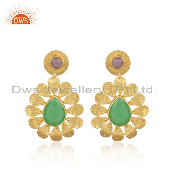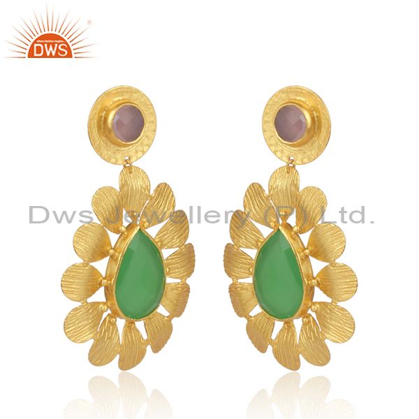 Pear Shaped Prehnite Set Floral Ethnic Gold On Brass Earring