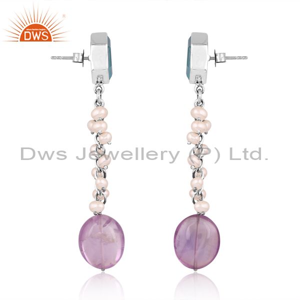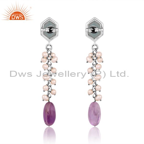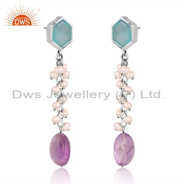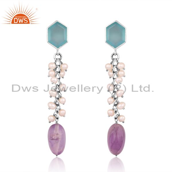 Pearl, Amethyst, Aqua Chalcedony Set Oxide Silver Earrings