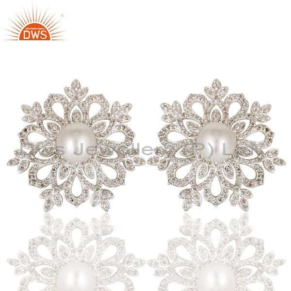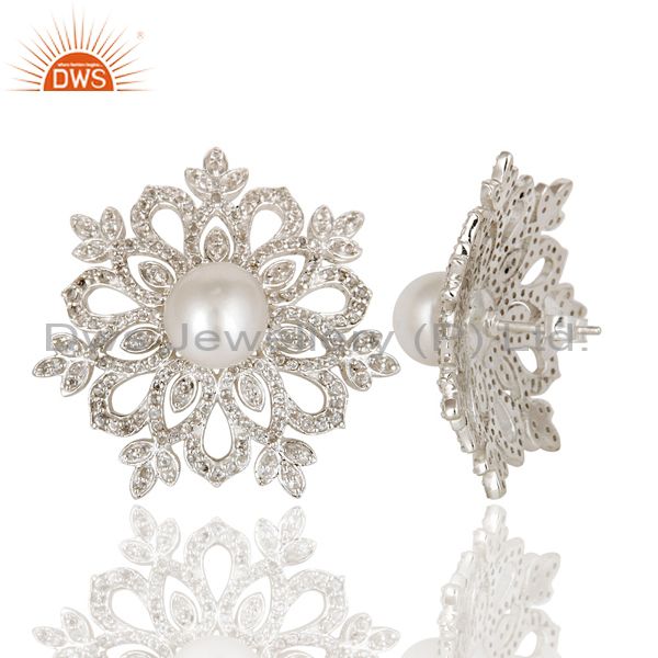 Pearl and White Topaz Sterling Silver Flower Designer Stud Earring