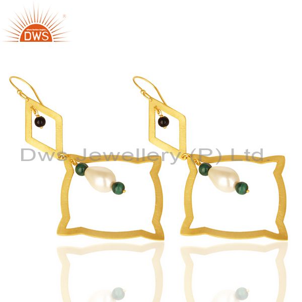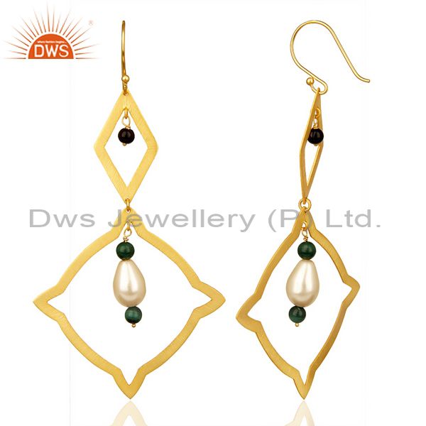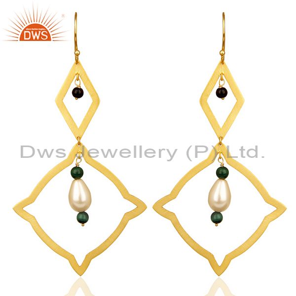 Pearl Malachite Long Dangle Boutique 14K Gold Plated 92.5 Silver Earring