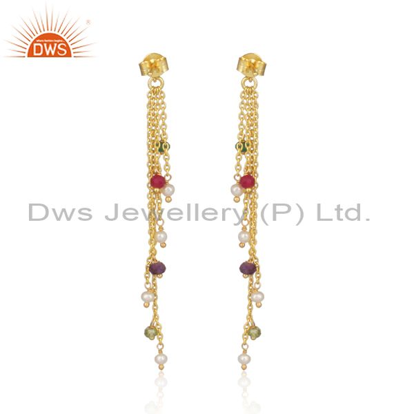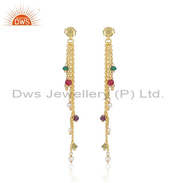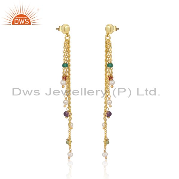 Pearl Set Gold On Silver Multi-Threads Colored End Earrings