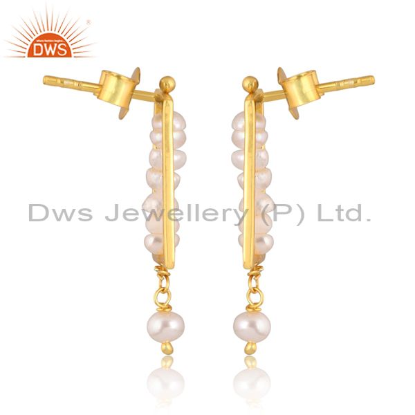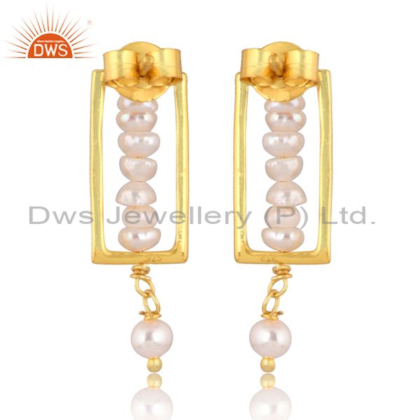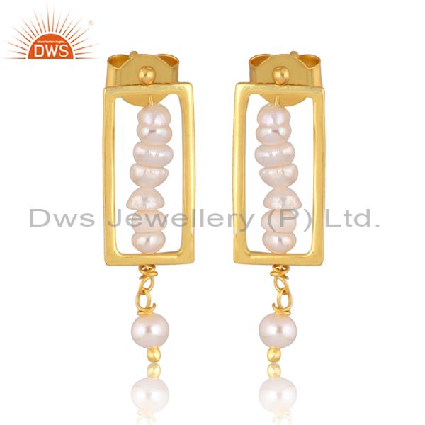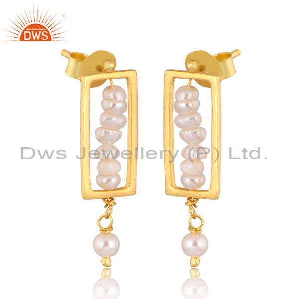 Pearl Set Gold On Sterling Silver Long Rectangular Earrings