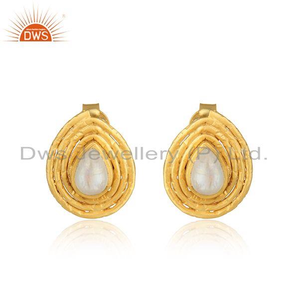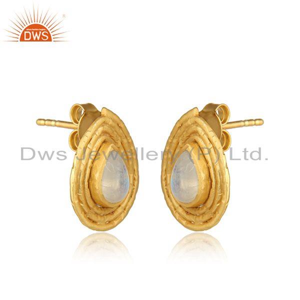 Pearl Shape Gold Plated 925 Silver Rainbow Moonstone Stud Earrings