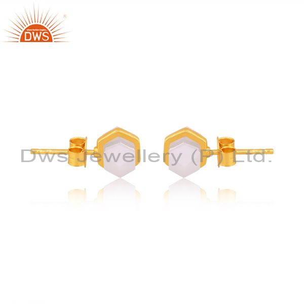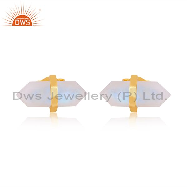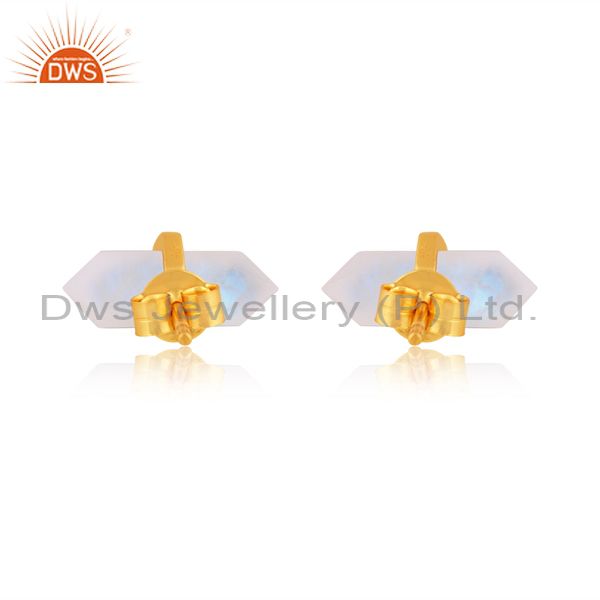 Pencil Cut Rainbow Moonstone Gold Plated Silver Stud Earring