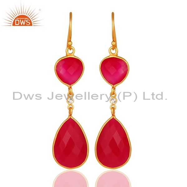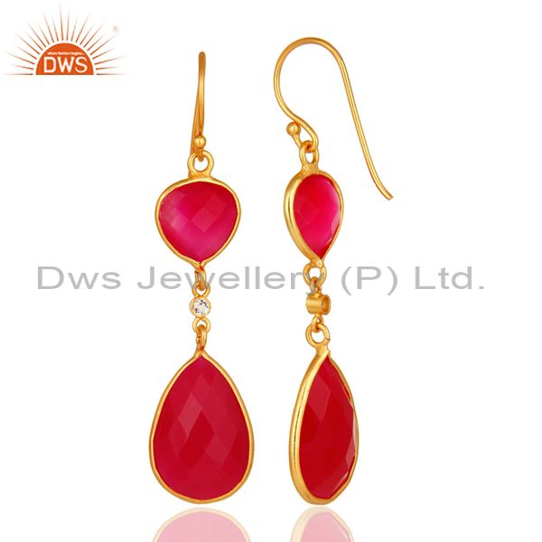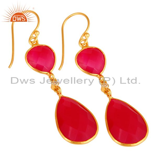 Pink Chalcedony Faceted Bezel-Set Gold Plated Sterling Silver Drop Earrings