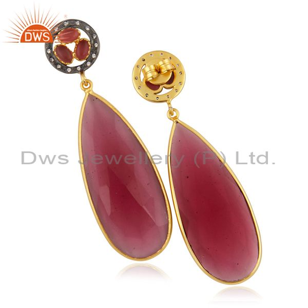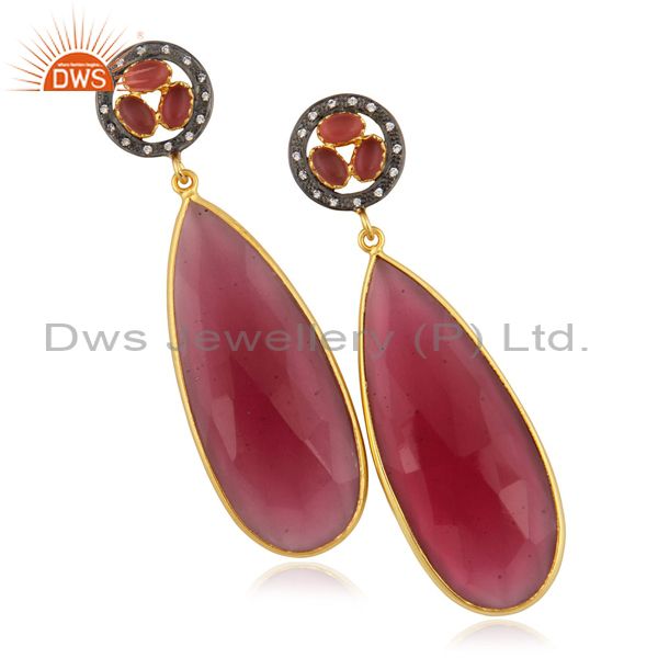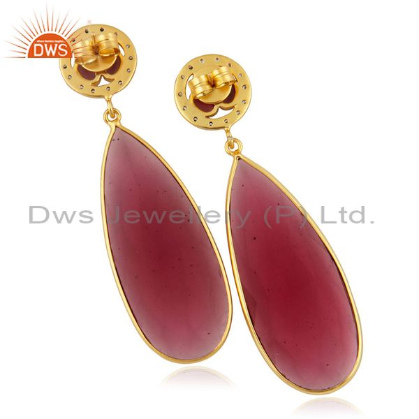 Pink Glass Bezel Set Fashion Long Drop Earrings With Cz In 14K Gold Over Brass