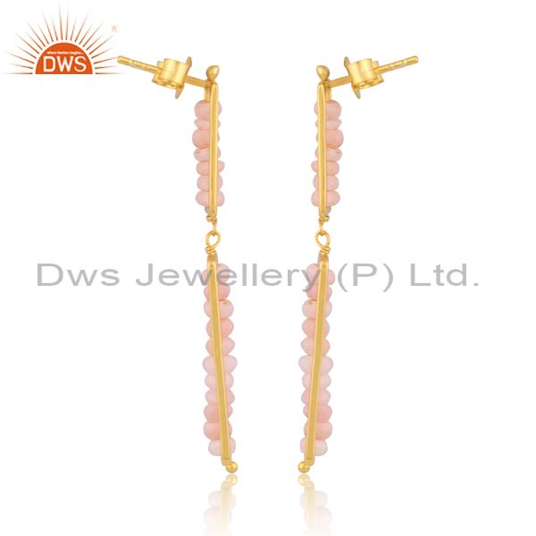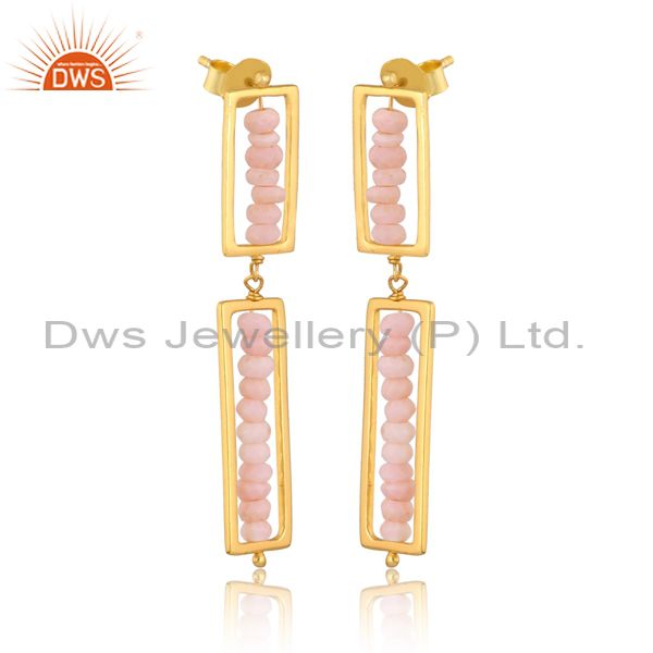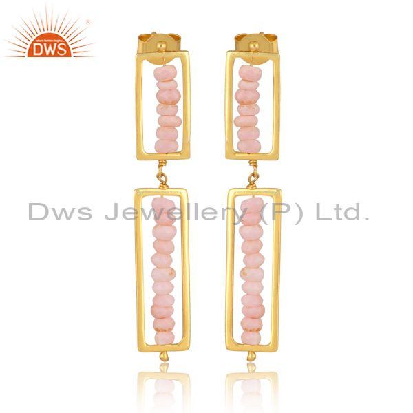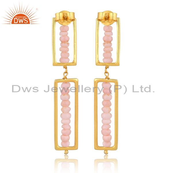 Pink Opal Set Gold On Silver Rectangular Long Drop Earrings