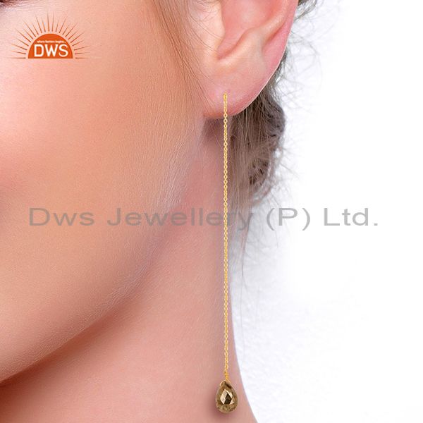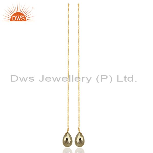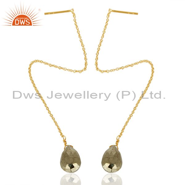 Pyrite Long Dangle Crossover 14K Gold Plated 92.5 Sterling Silver Earring