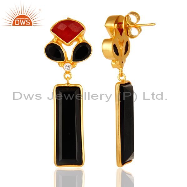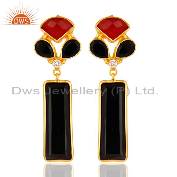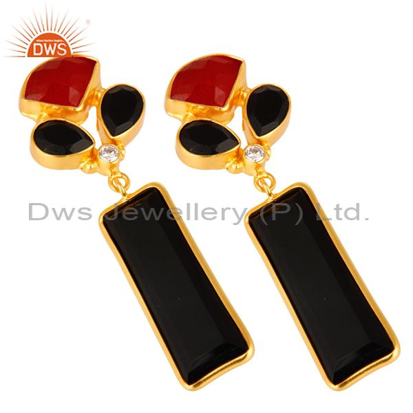 Red Aventurine And Black Onyx Gemstone 14K Yellow Gold Plated Dangle Earrings