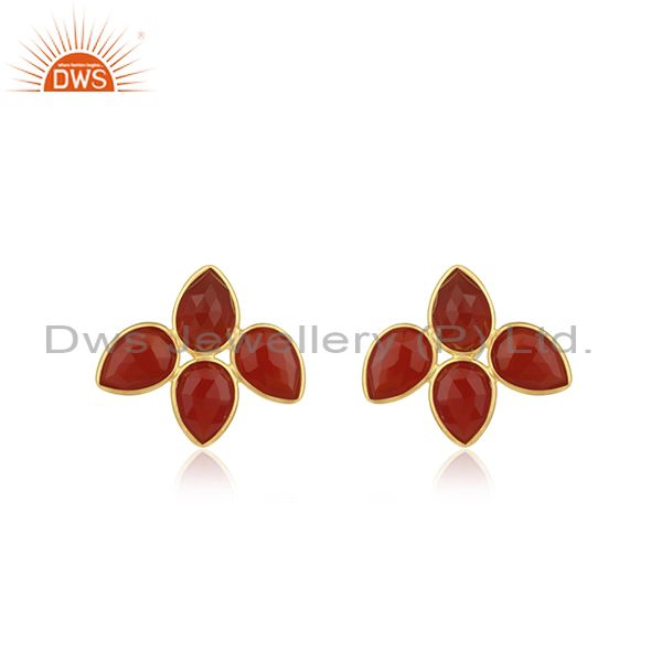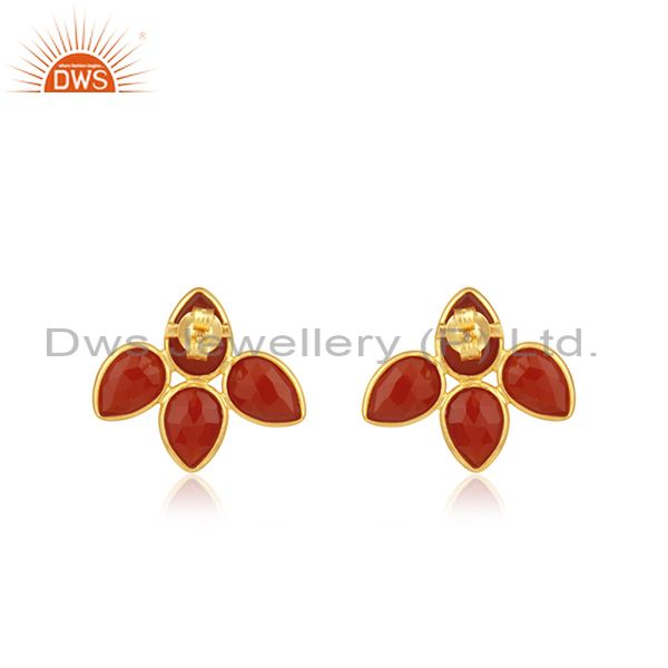 Red Onyx Gemstone Leaf Design Gold Plated 925 Silver Stud Earrings Jewelry