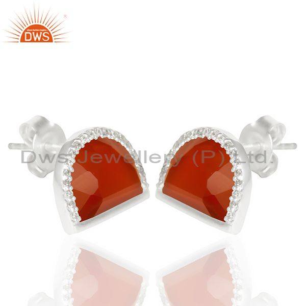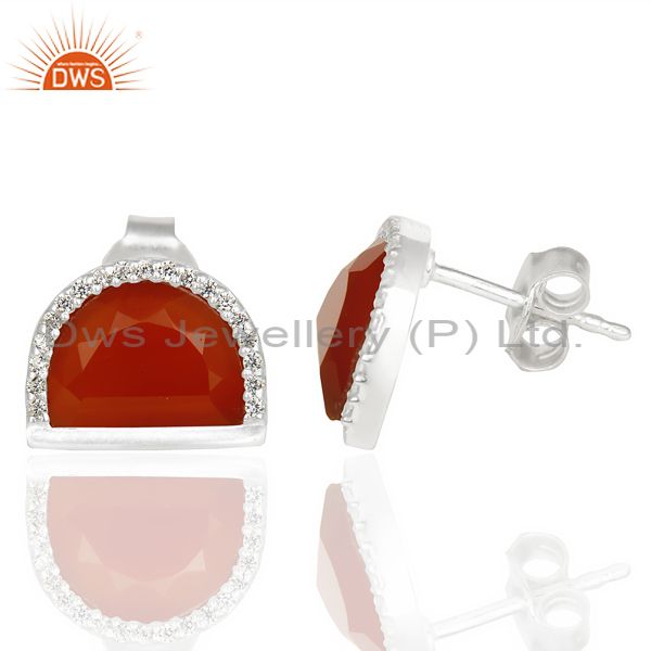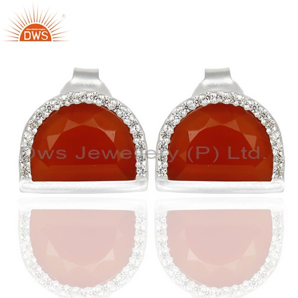 Red Onyx Half Moon Cz Stud 92.5 Sterling Silver Trendy Earring