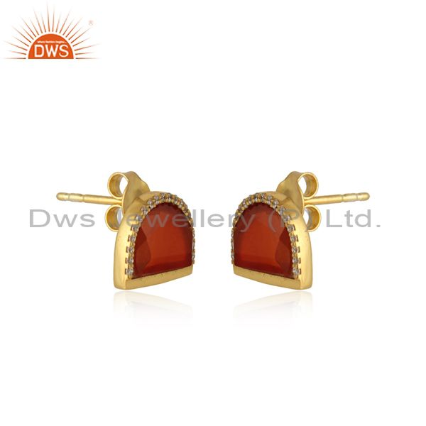 Red Onyx Half Moon Cz Stud Gold Plated 92.5 Sterling Silver Earring
