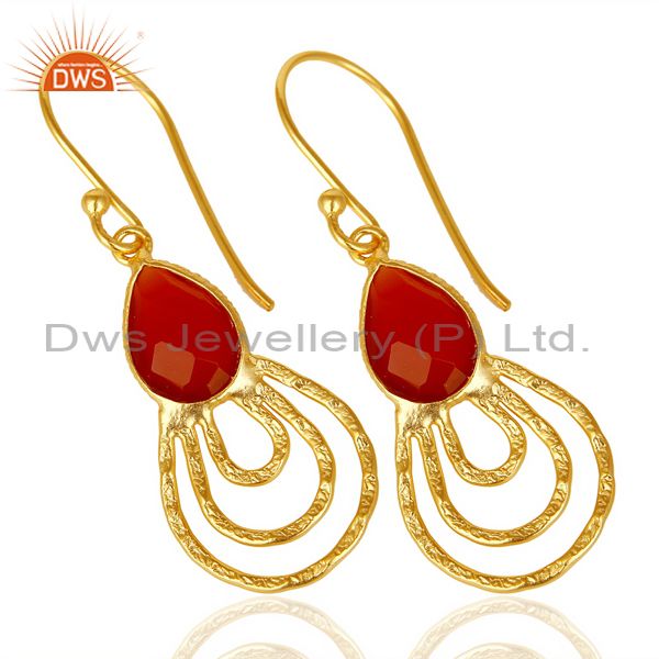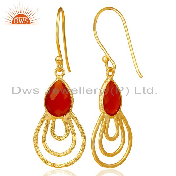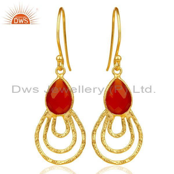 Red Onyx Hammered Drop Dangle 14K Gold Plated 92.5 Sterling Silver Earring