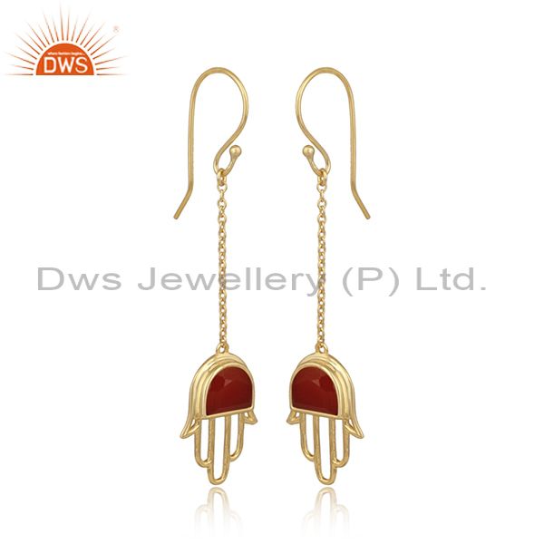 Red Onyx Hamsa 925 Silver Gold Plated Ear Wire Earrings