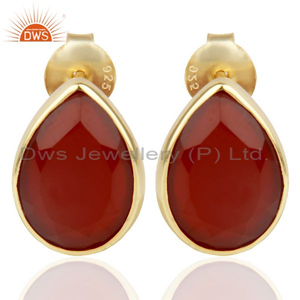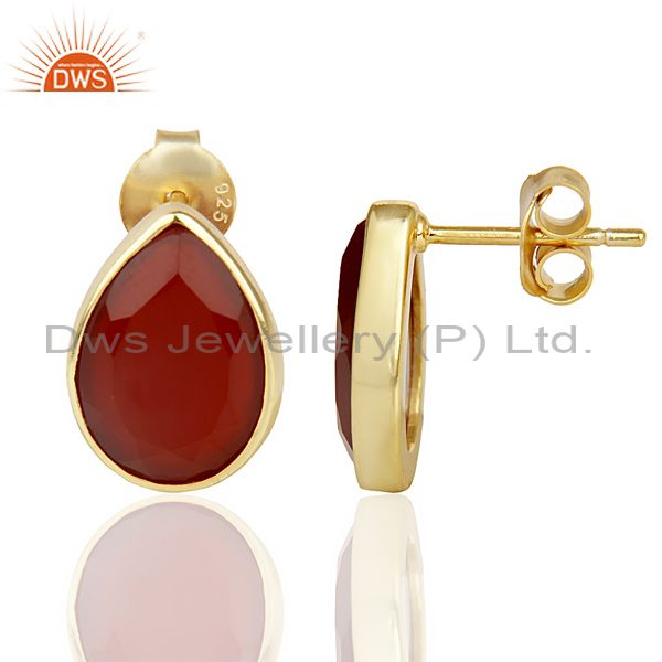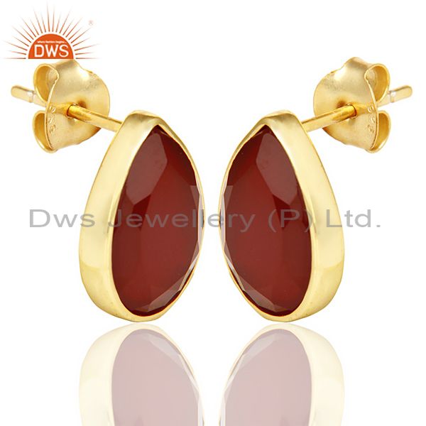Red Onyx Pear Shape Flat Back Gold Plated Stud Earring In Solid Silver