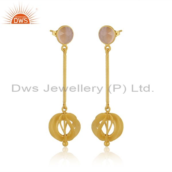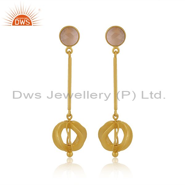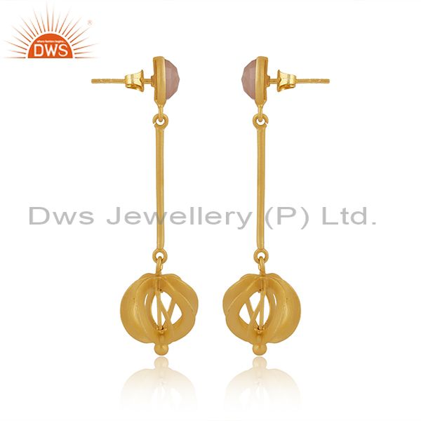 Rose Chalcedony Set Brass Gold Long Drop Classic Earrings