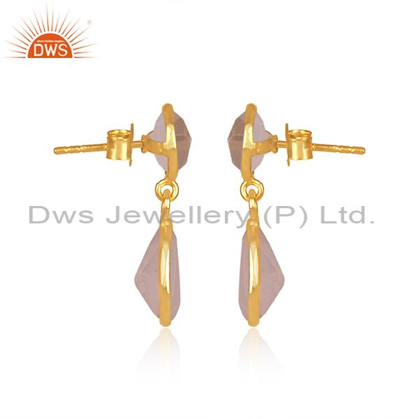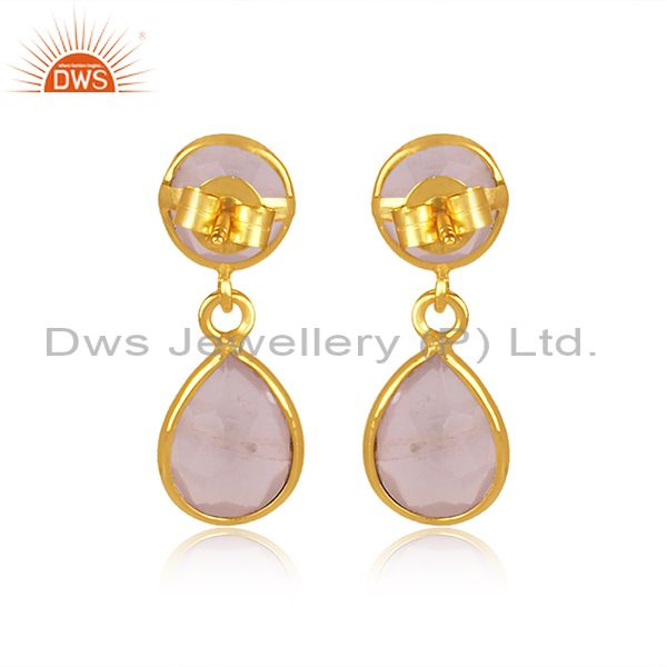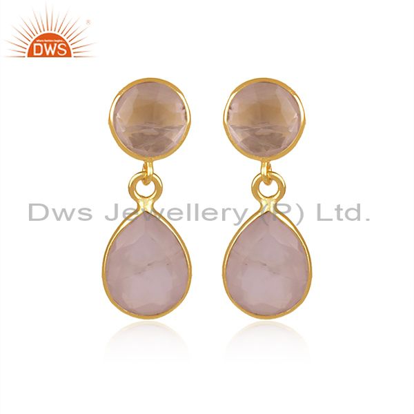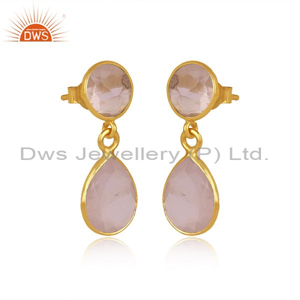 Round And Pear Cut Rose Quartz Set Gold On Silver Earrings