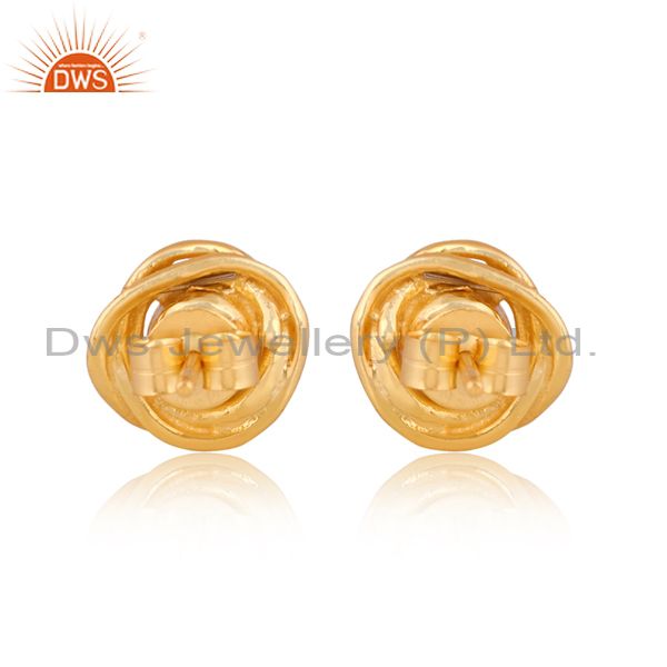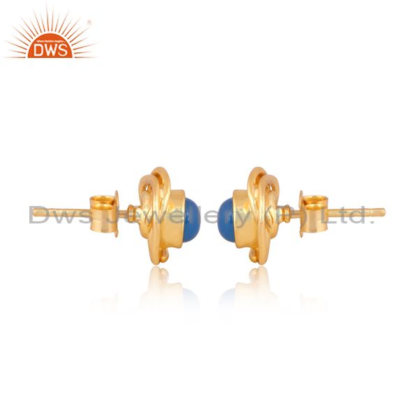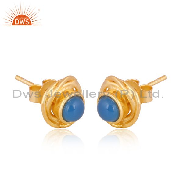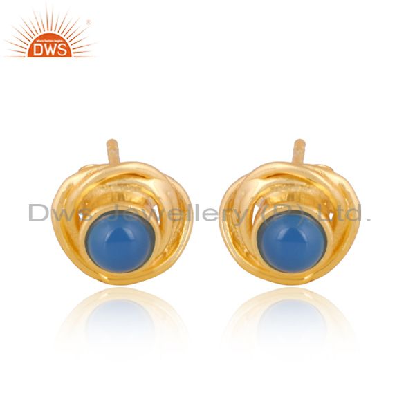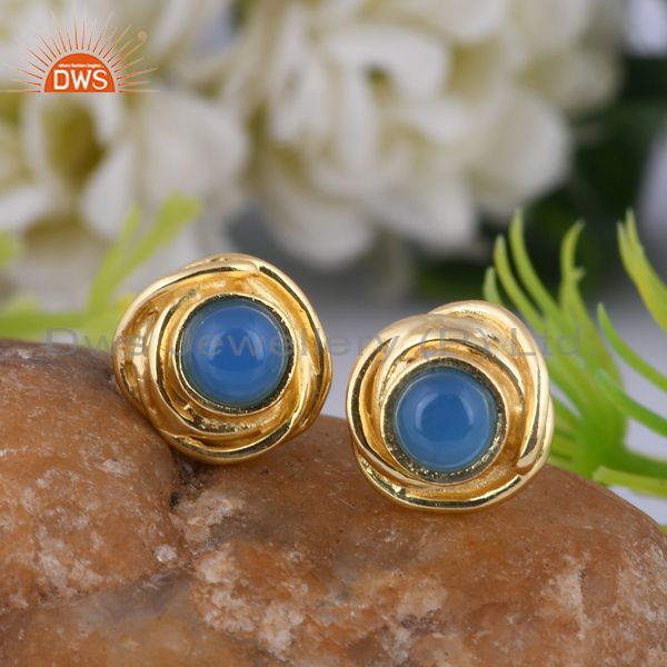 Round Blue Chalcedony Gold On 925 Silver Classic Earrings