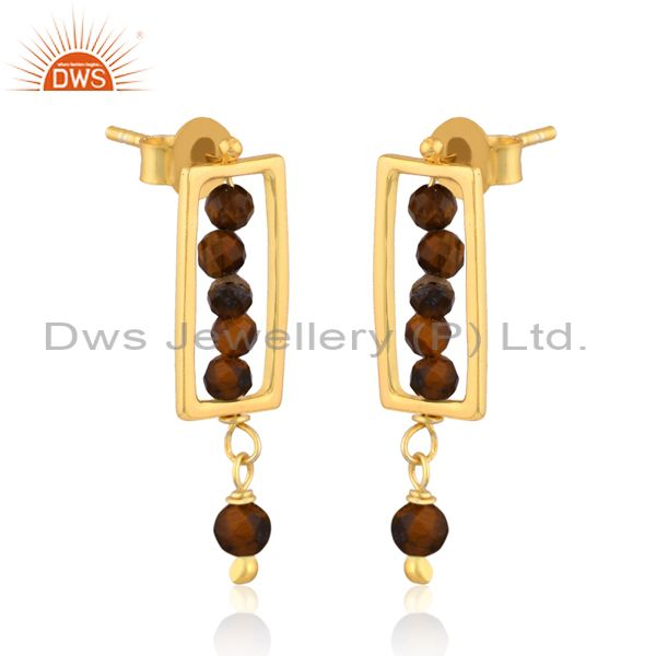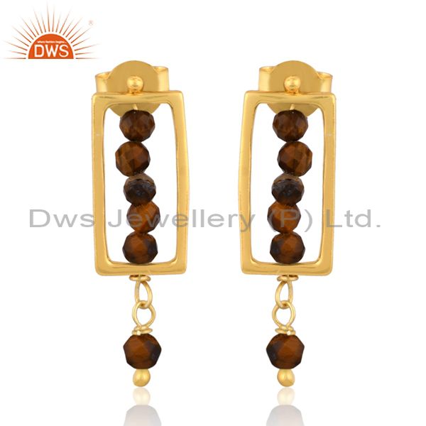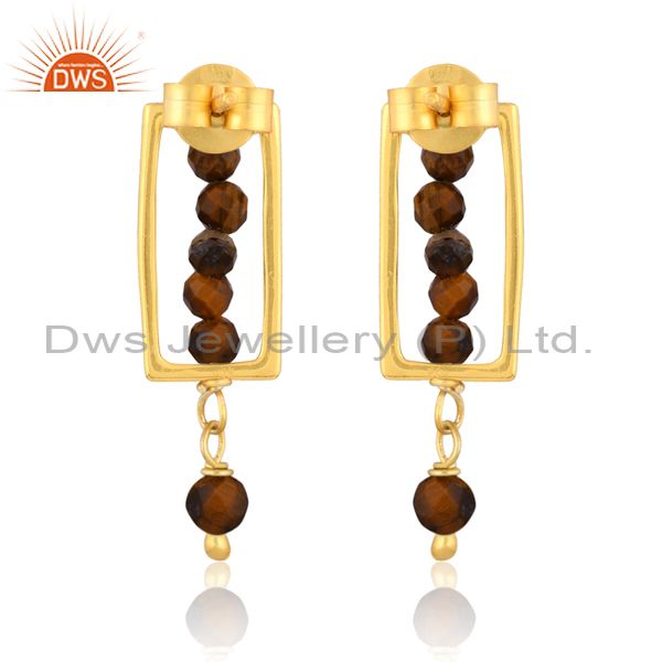 Round Cut Yellow Tiger Eye Set 18K Gold On Silver Earrings