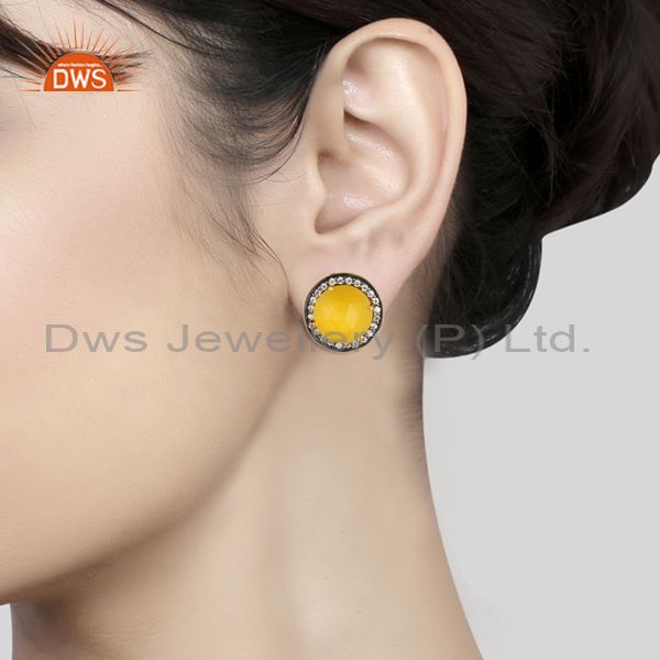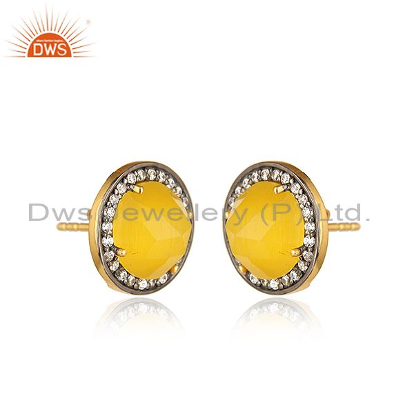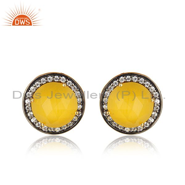 Round Gold Plated Silver CZ Yellow Moonstone Gemstone Stud Earring