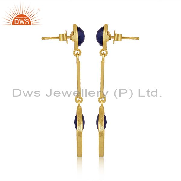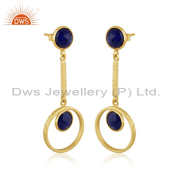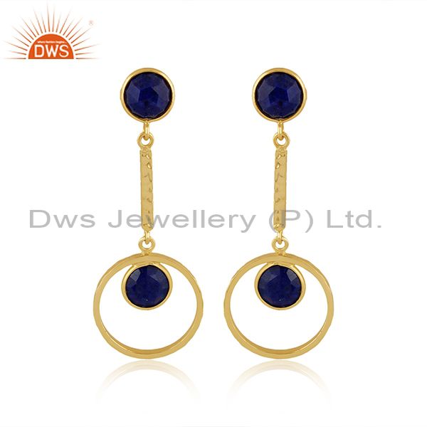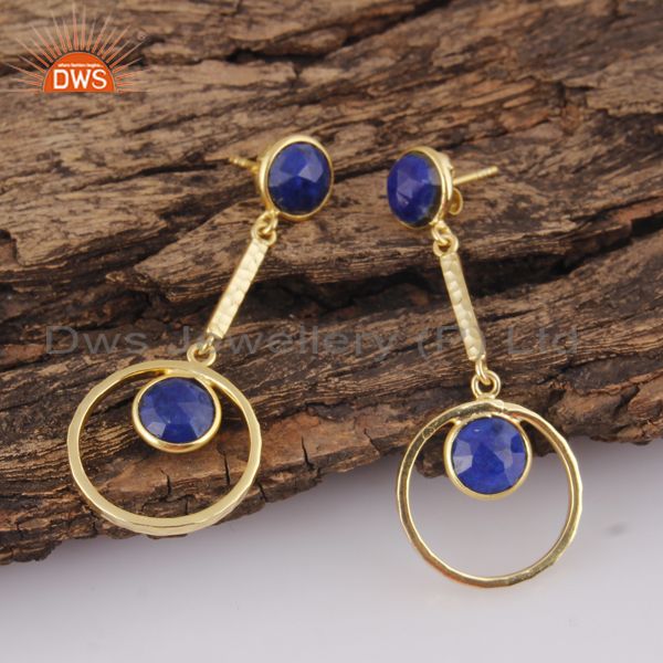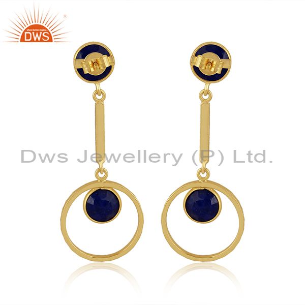 Round Lapis Set Gold On Sterling Silver Long Drop Earrings