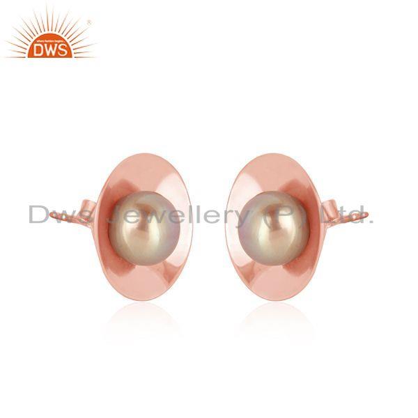 Round Shape Rose Gold Plated Gray Pearl Gemstone Stud Earrings Jewelry