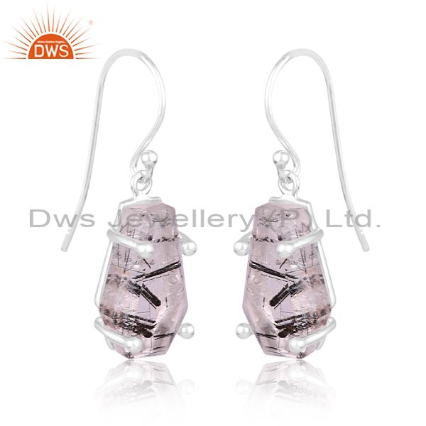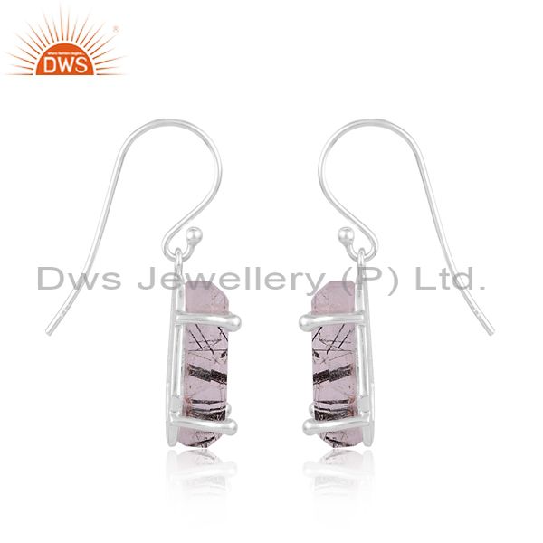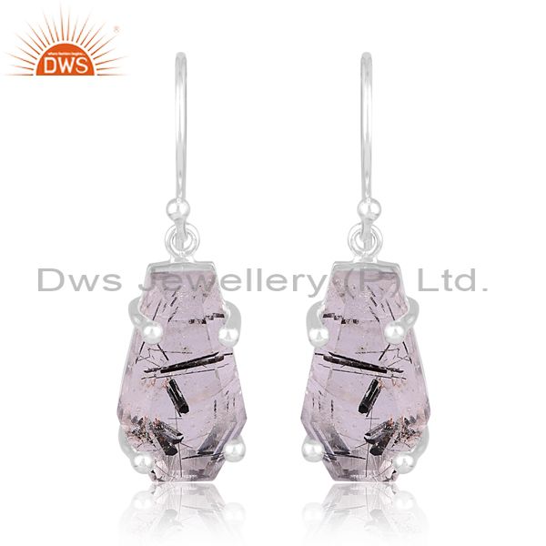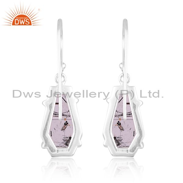 Silver Earring With Coffin Shaped Black Rutile Flat Cut Gem