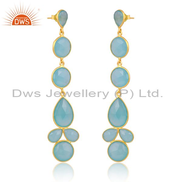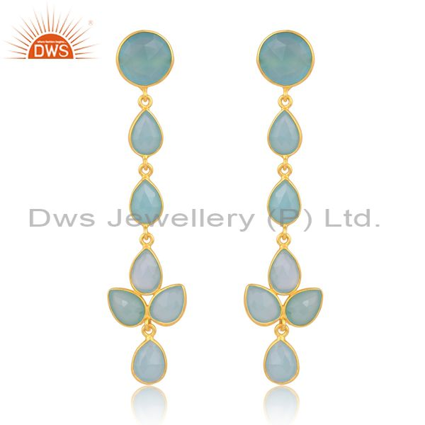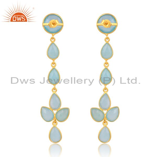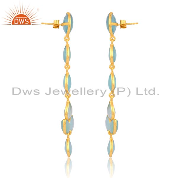 Silver Gold Earrings With Aqua Chalcedony Briollette Stone