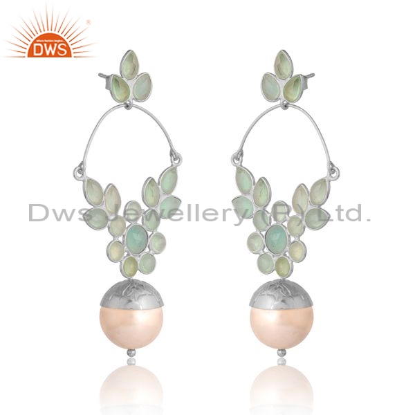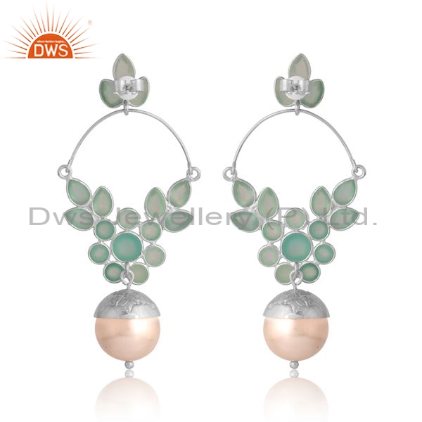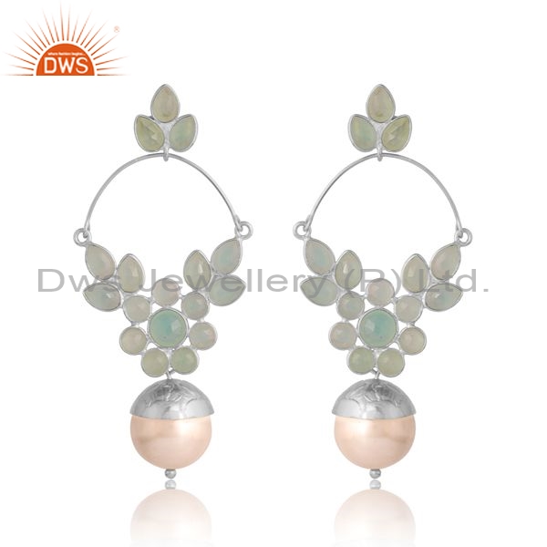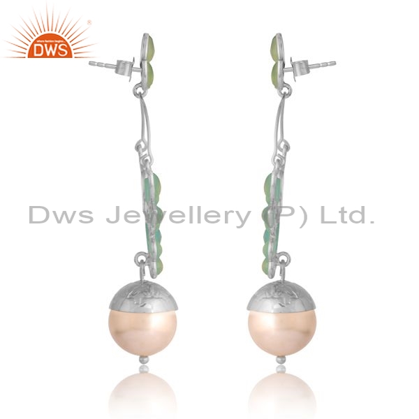 Silver White Earring With Aqua Chalcedony And Pearl Beads