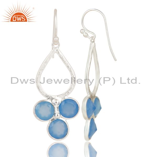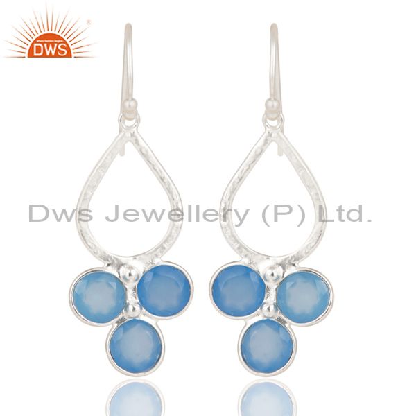 Solid 925 Sterling Silver Dyed Blue Chalcedony Bezel Set Dangle Earrings