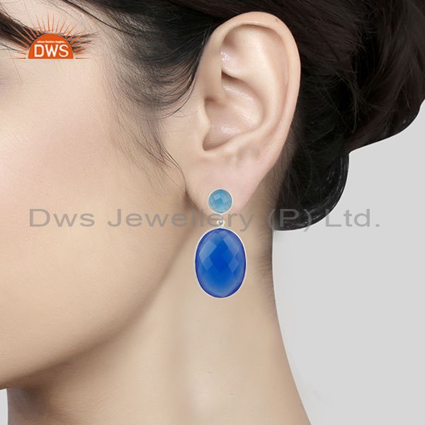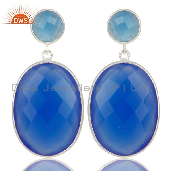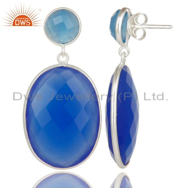 Solid 925 Sterling Silver Faceted Blue Chalcedony Bezel Set Drops Earrings
