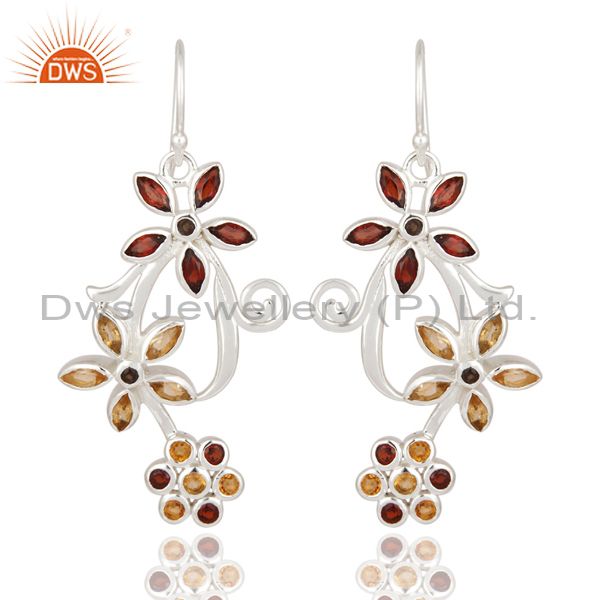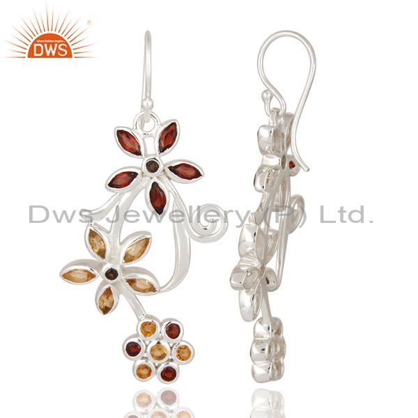 Solid 925 Sterling Silver Garnet, Smoky Quartz And Citrine Dangle Earrings