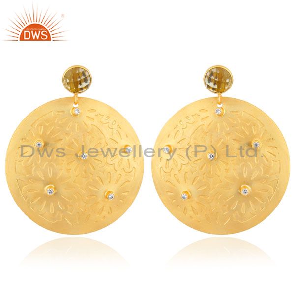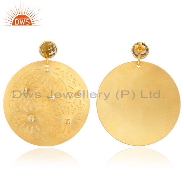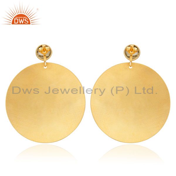 Solid Brass Metal 18K Gold Toned Lemon Quartz Disc Design Circle Cz Stud Earring