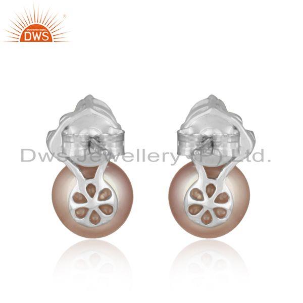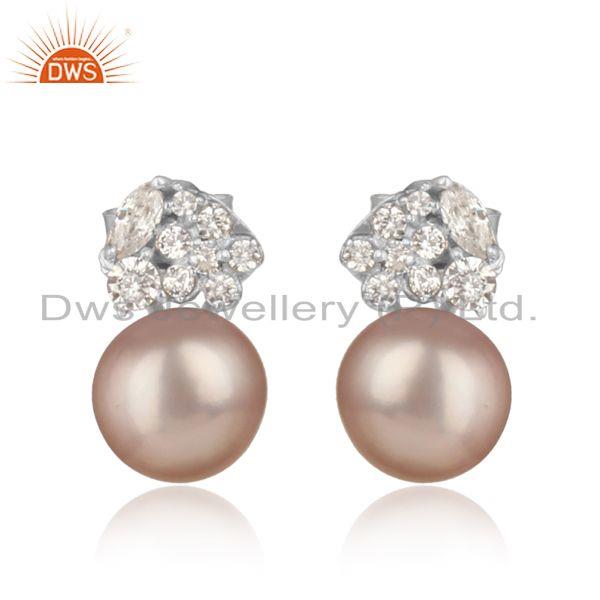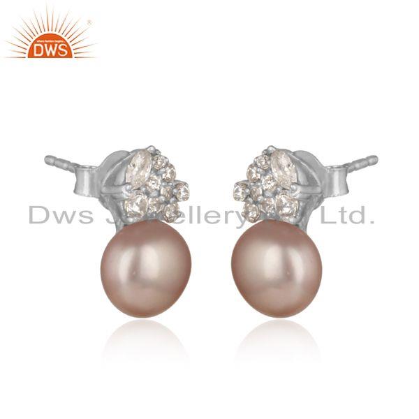 Spring Designer Rhodium On Silver 925 Stud With Gray Pearl And Cz