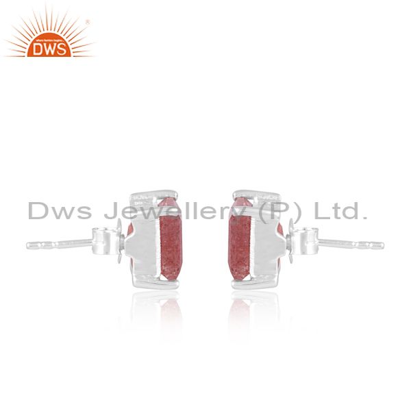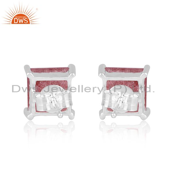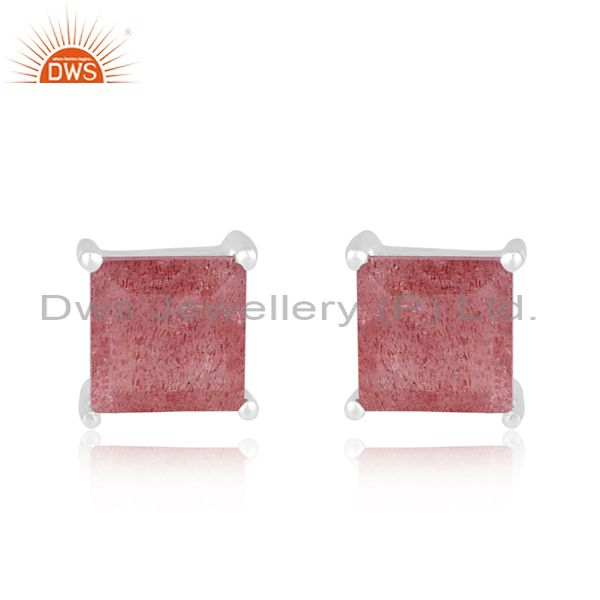 Square Shaped Silver Stud Earrings With Strawberry Quartz