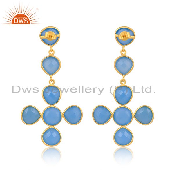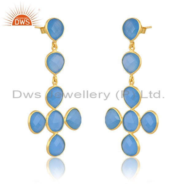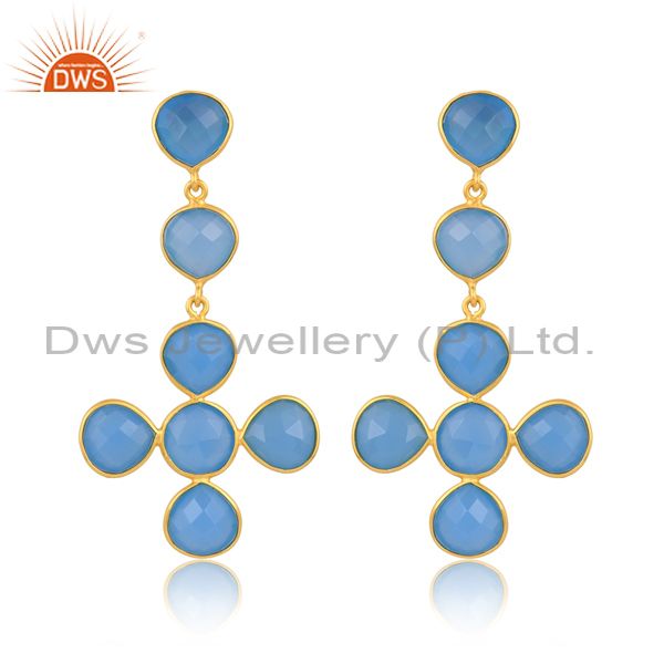 Sterling Silver Drop Earring In Gold With Blue Chalcedony