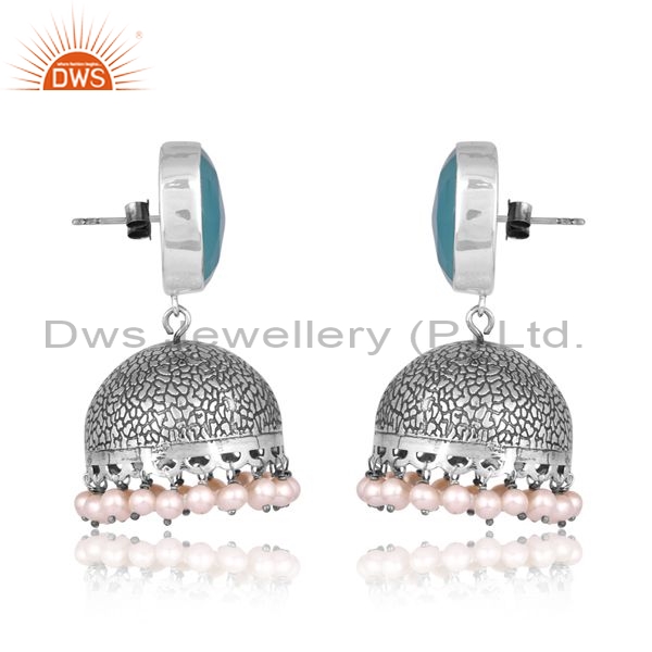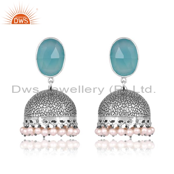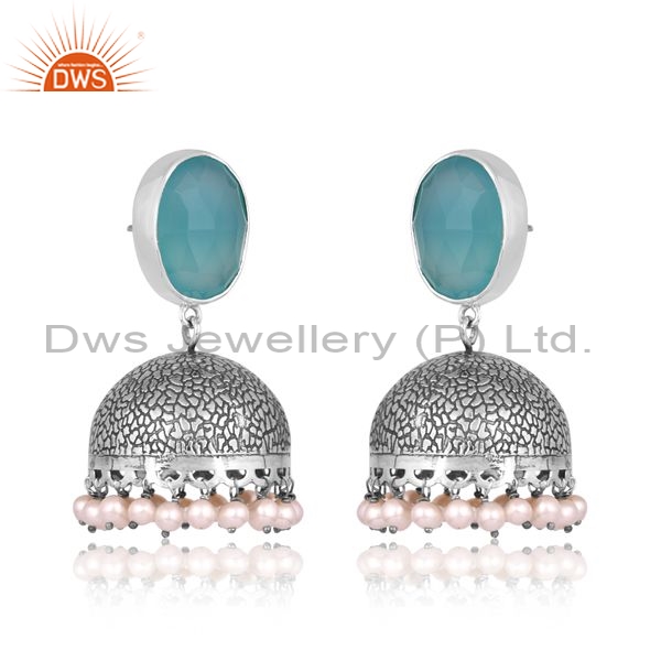 Sterling Silver Jhumkas With Pearl And Aqua Chalcedony