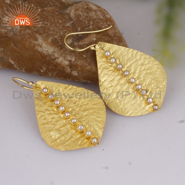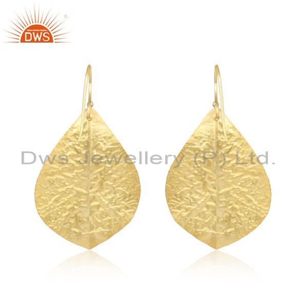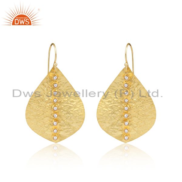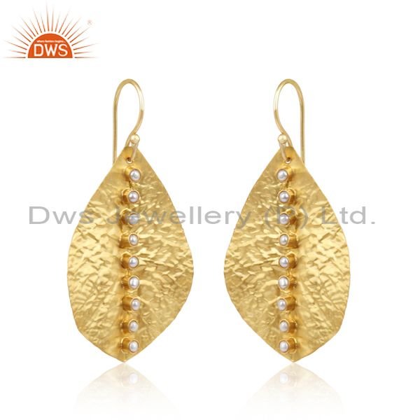 Textured Leaf Design Yellow Gold on Fashion Pearl Earring