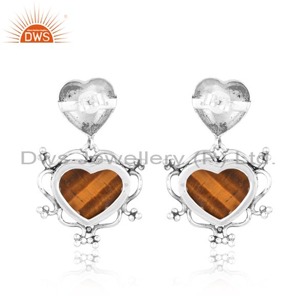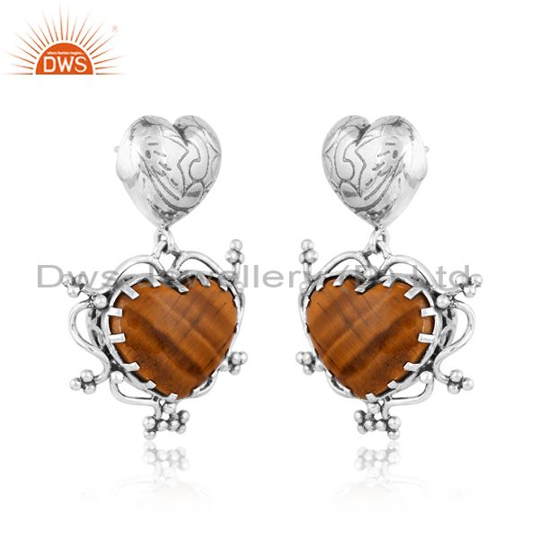 Tiger Eye Yellow Cabochon Heart Oxidized Silver Earrings