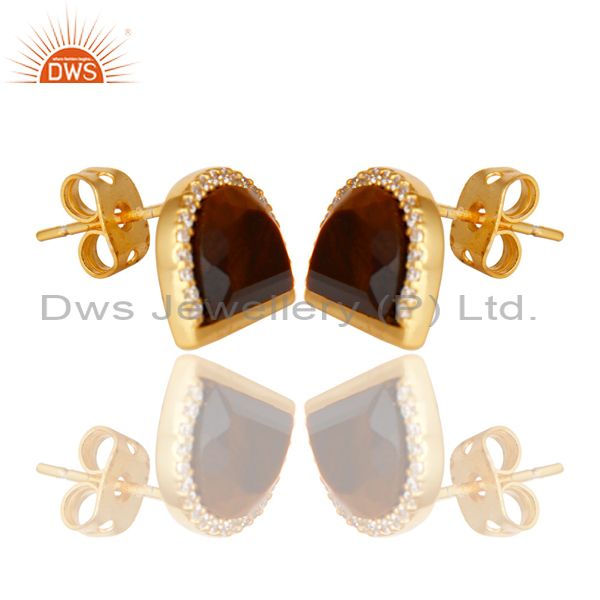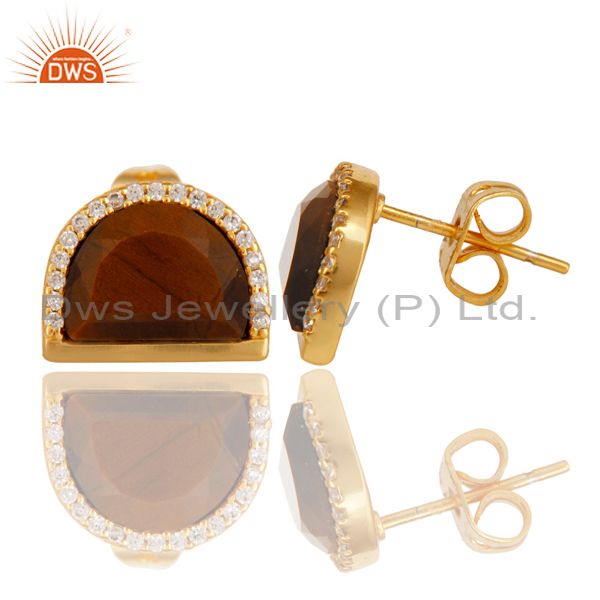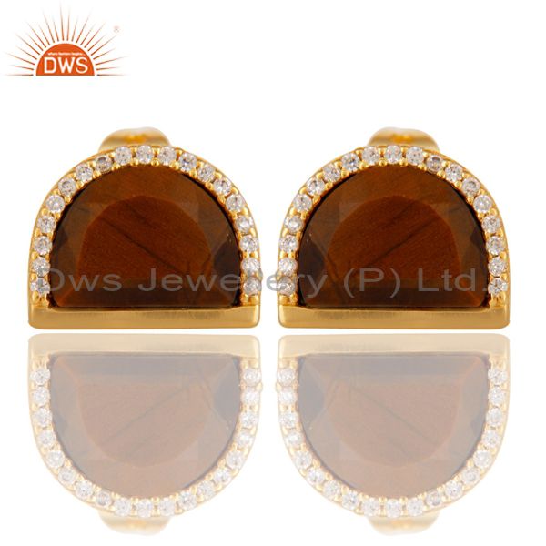 Tigereye Half Moon Cz Stud Gold Plated 92.5 Sterling Silver Earring