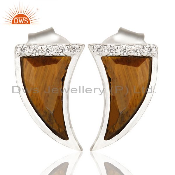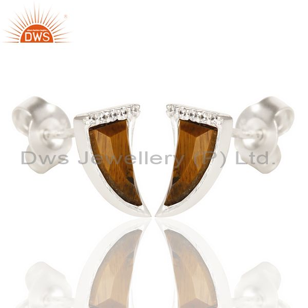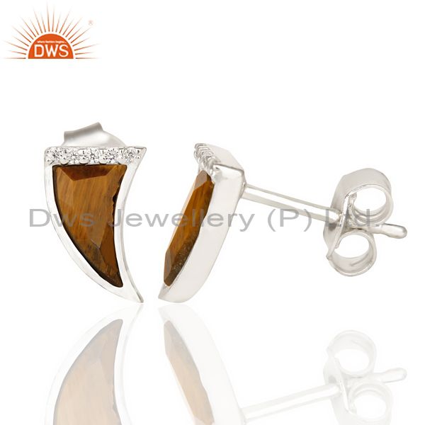 Tigereye Tiny Horn Cz Studded Post 92.5 Sterling Silver Small Earring