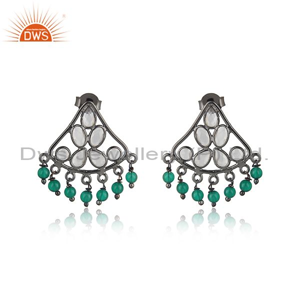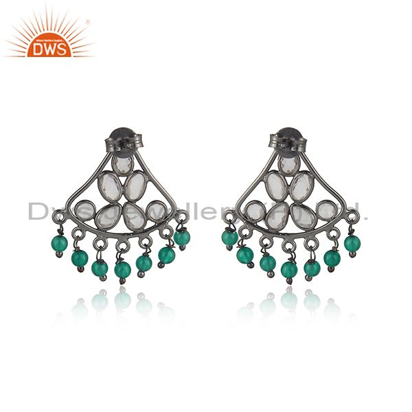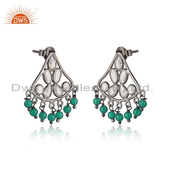 Traditional Design Green Onyx, Cz Silver Earring In Black Rhodium