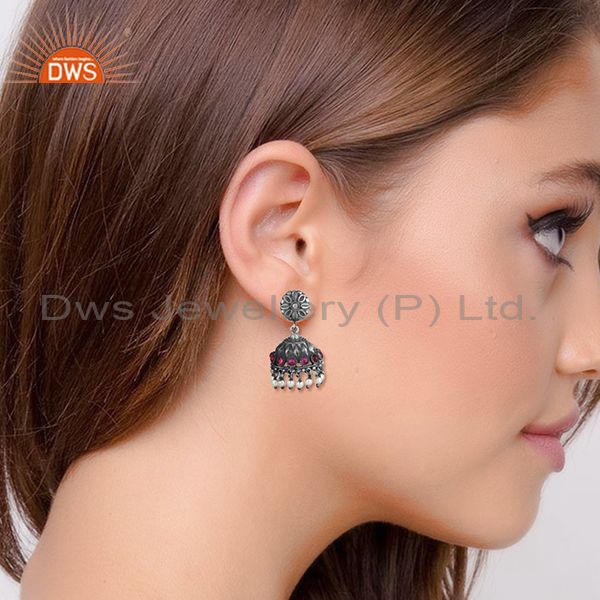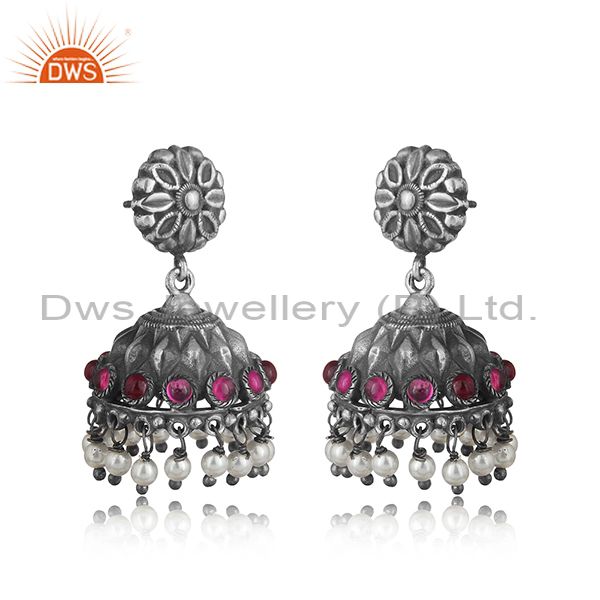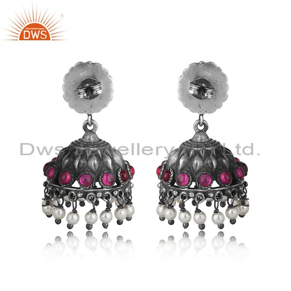 Traditional Design Textured Tribe Red Stone Jhumka in Oxidized Silver