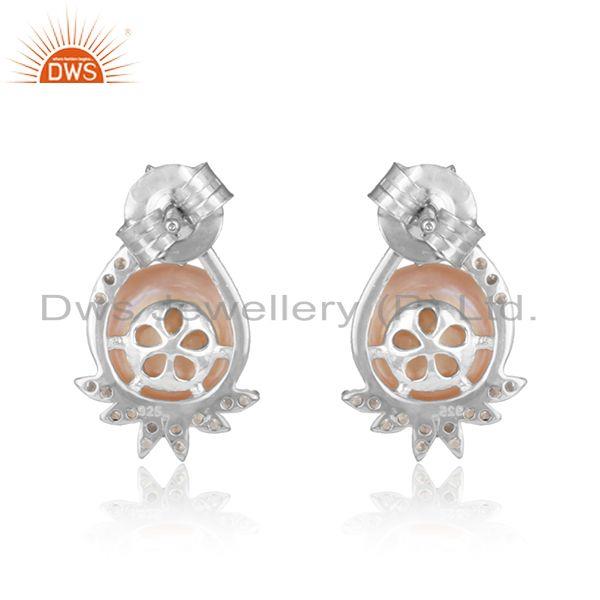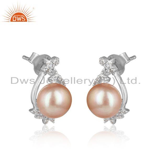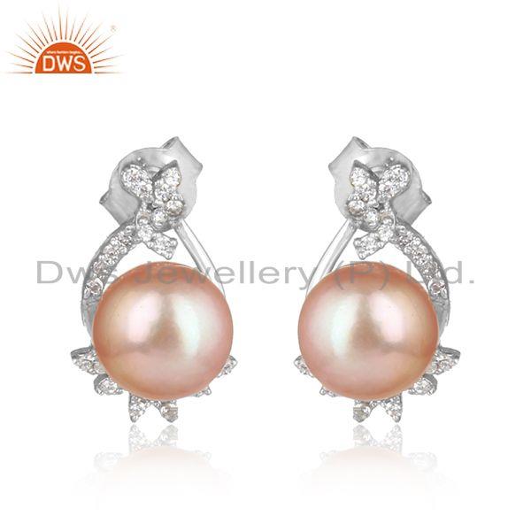 Trendy Design Rhodium On Silver 925 Studs With Cz And Pink Pearl