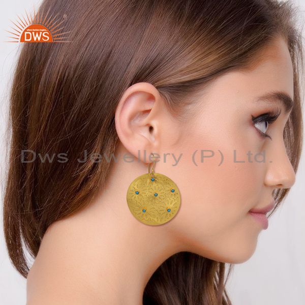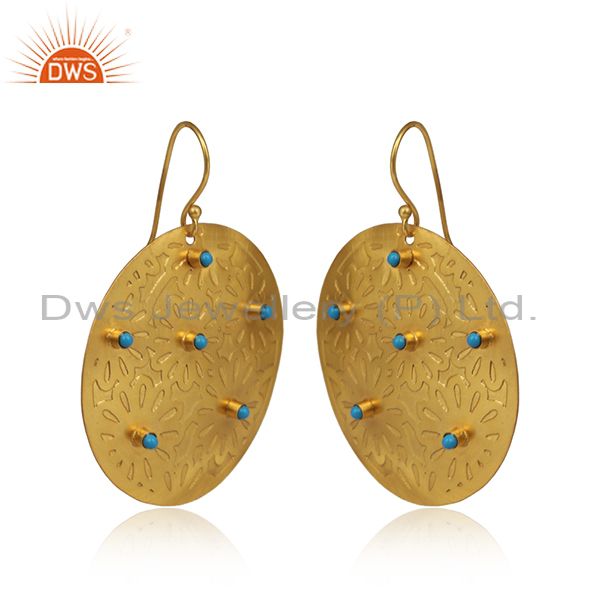 Turquoise Cultured Dangle 14K Yellow Gold Plated Brass Earrings Handmade Jewelry