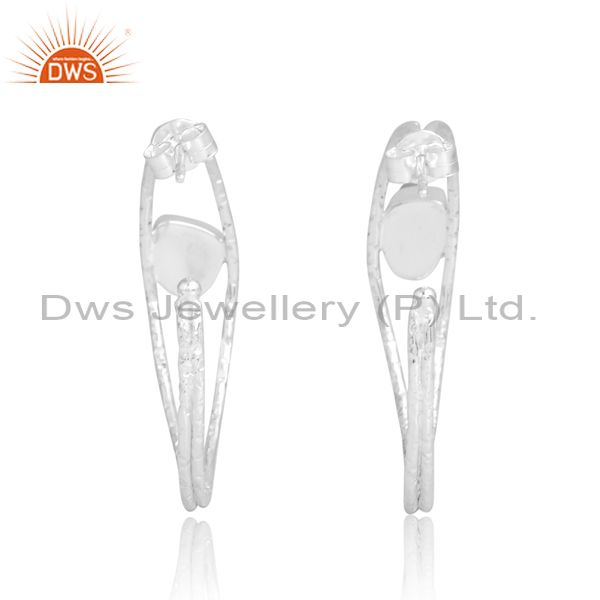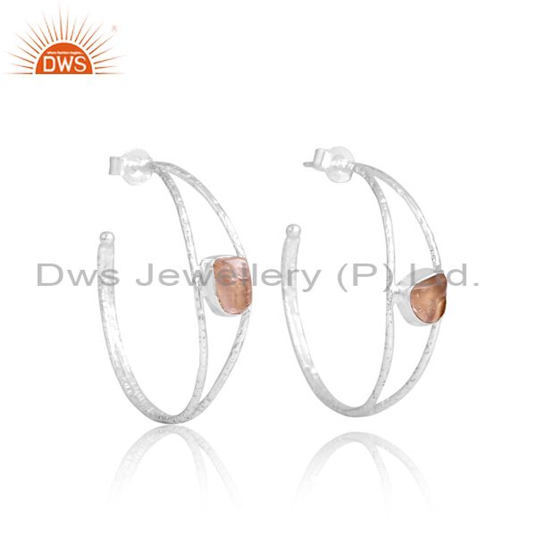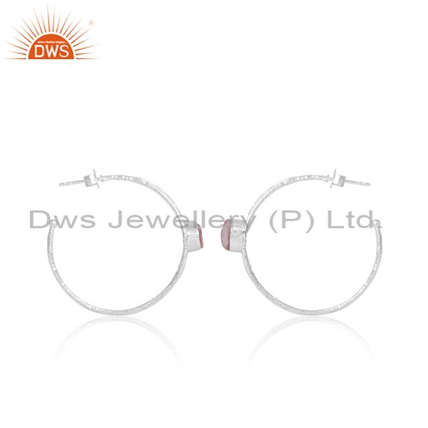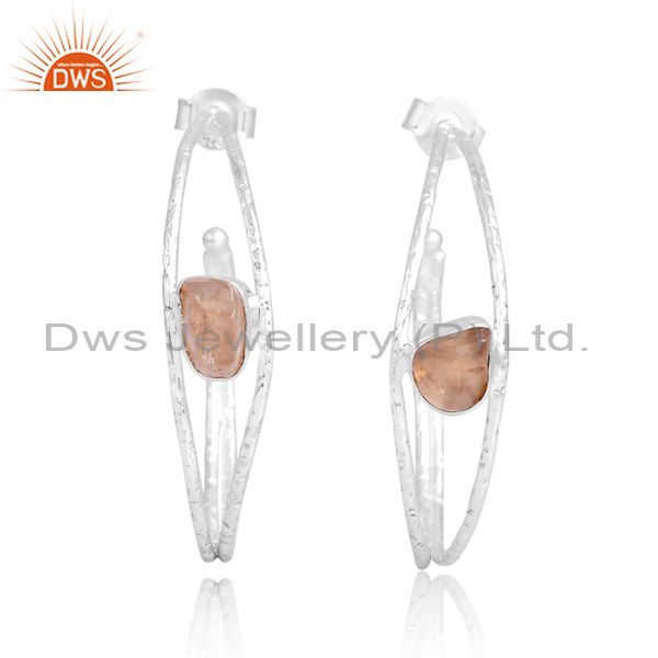 Unique Silver Hoop Earrings With Rose Quartz Rough Stone