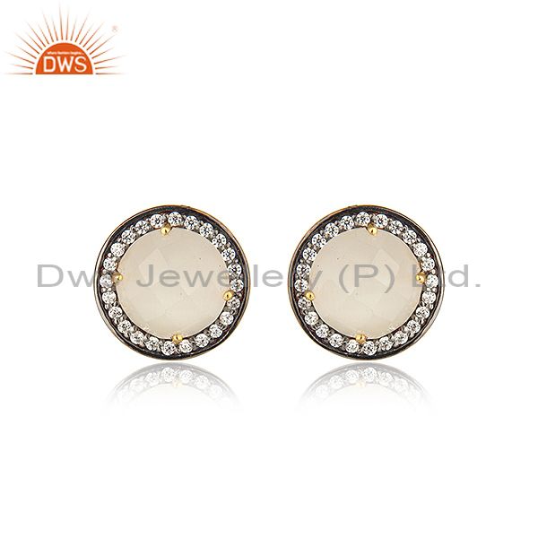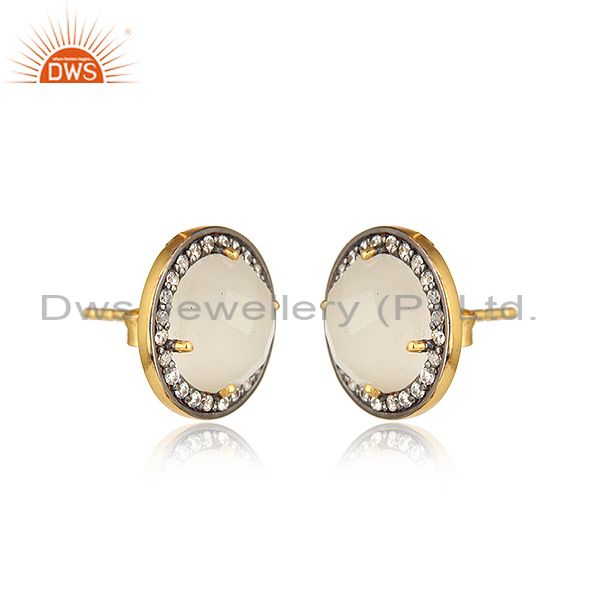 White Moonstone Cz Gemstone Gold Plated Silver Stud Earrings