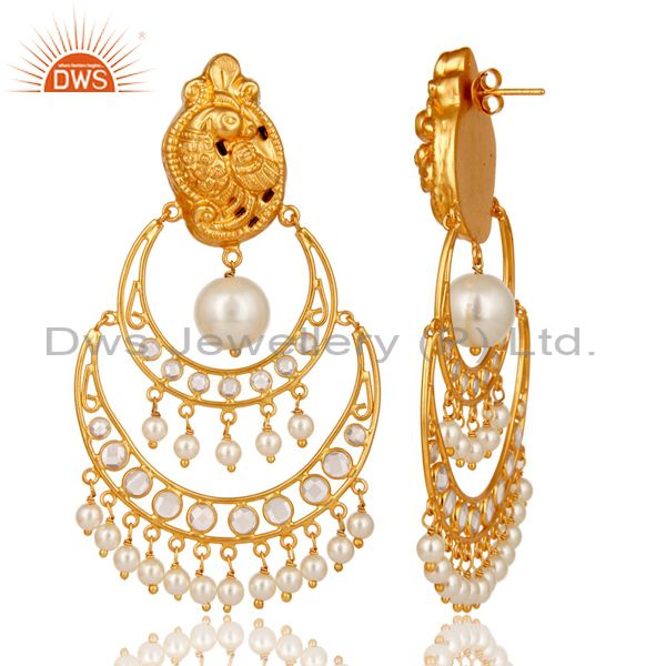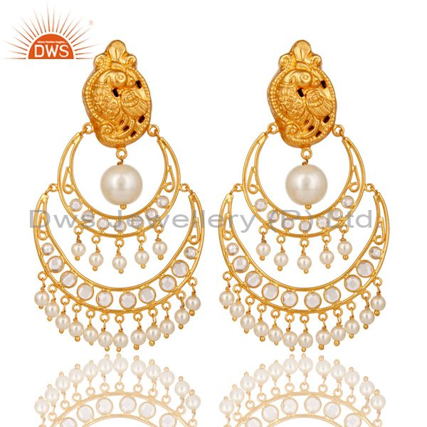 White Pearl and CZ 18K Gold Plated Sterling Silver Temple Earring Stud